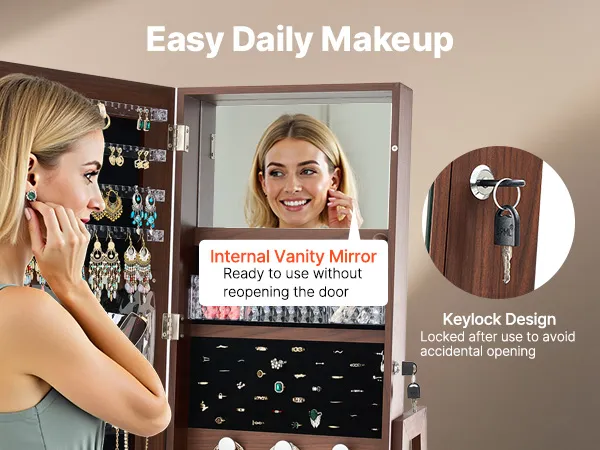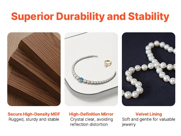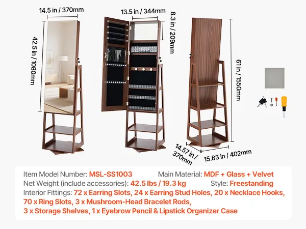 Wysokiej jakości materiały: To stojące lustro z miejscem do przechowywania wykonane jest z wytrzymałego drewna konstrukcyjnego o gramaturze 44,9 funta/stopę³, dzięki czemu jest trwałe, odporne na zużycie i stabilne. Miękka, pluszowa wyściółka chroni biżuterię, a wysokiej jakości szklane lustro lśni jak nowe po umyciu.