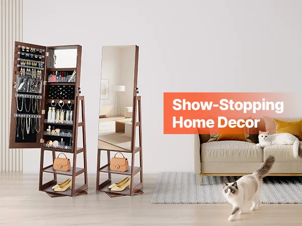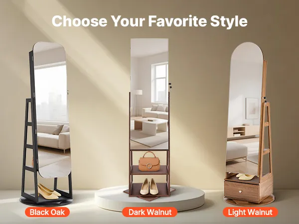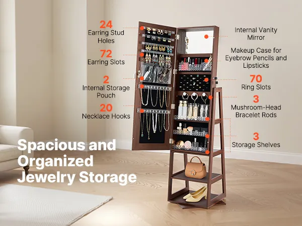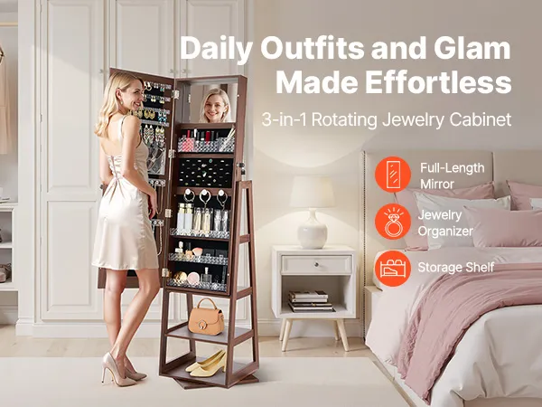 Funkcjonalny design 3 w 1: To coś więcej niż tylko szafka na biżuterię – to obrotowe lustro na biżuterię to lustro o pełnej długości, obracające się o 360° i zintegrowane z lustrem do makijażu. Przechowuj buty i torebki poniżej, aby mieć pod ręką swój strój i wyglądać pewnie na każdą okazję.