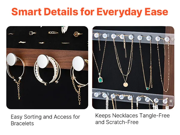 Stojące lustro z miejscem do przechowywania wyposażone jest w haczyki na naszyjniki, dzięki czemu naszyjniki będą uporządkowane i nie będą się plątać.