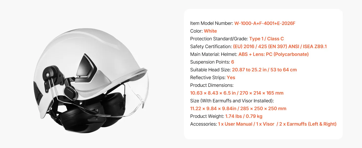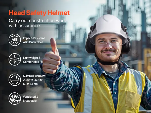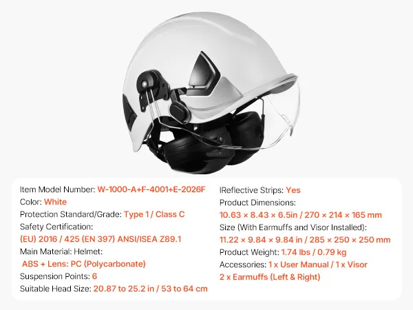 Kask ochronny ABS z atestem VEVOR ANSI/ISEA Z89.1 z osłoną i nausznikami, regulowany, wentylowany hełm przemysłowy, hełm roboczy do prac budowlanych w przemyśle, biały