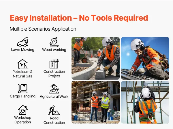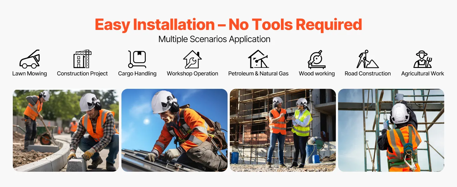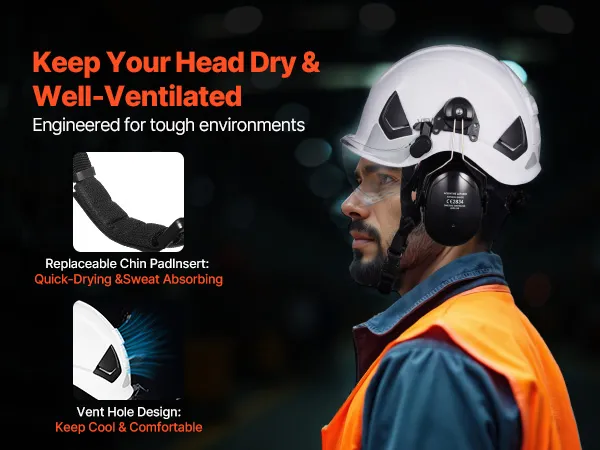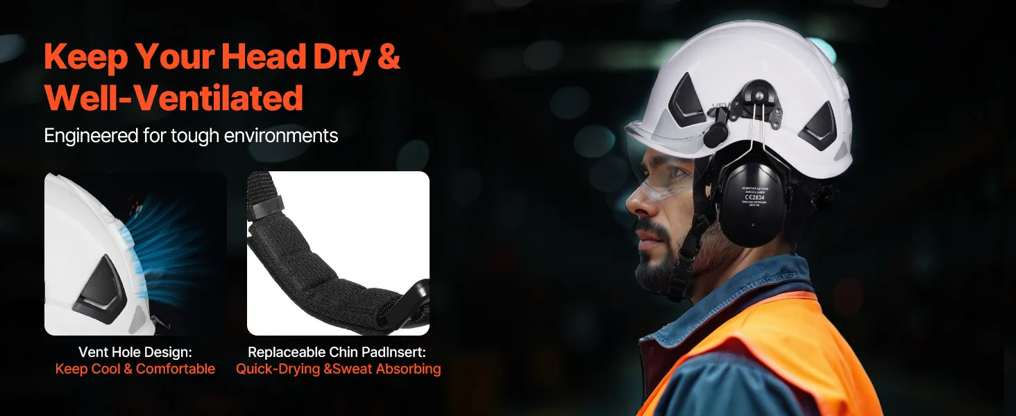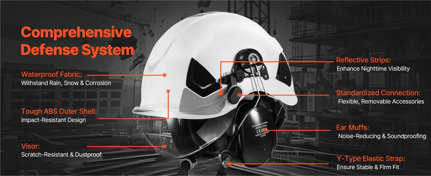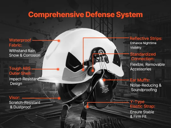 Udoskonalona konstrukcja: Wyposażony w paski odblaskowe zapewniające widoczność w każdym kierunku w ciemnych miejscach, zdejmowany daszek chroniący przed oślepiającym blaskiem i zabrudzeniami oraz ochronniki słuchu redukujące hałas. Ten hełm ochronny z paskiem podbródkowym został zaprojektowany do pracy w trudnych warunkach.