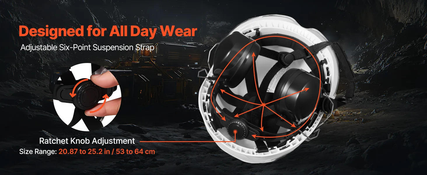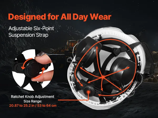 Dzięki 6-punktowemu zawieszeniu i płynnemu zapięciowi zapadkowemu będziesz czuć się komfortowo przez cały dzień. Nasz kask ochronny łatwo dopasowuje się do obwodu głowy od 53 do 64 cm, zapewniając bezpieczne i stabilne dopasowanie do każdego zadania.