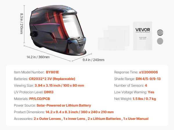 Automatyczna maska spawalnicza VEVOR, True Color, 100 x 80 mm, zasilana energią słoneczną, z 4 czujnikami łuku, DIN 4/5-9/9-13 do spawania, cięcia i szlifowania metodą TIG, MIG i łukiem elektrycznym – seria METIS