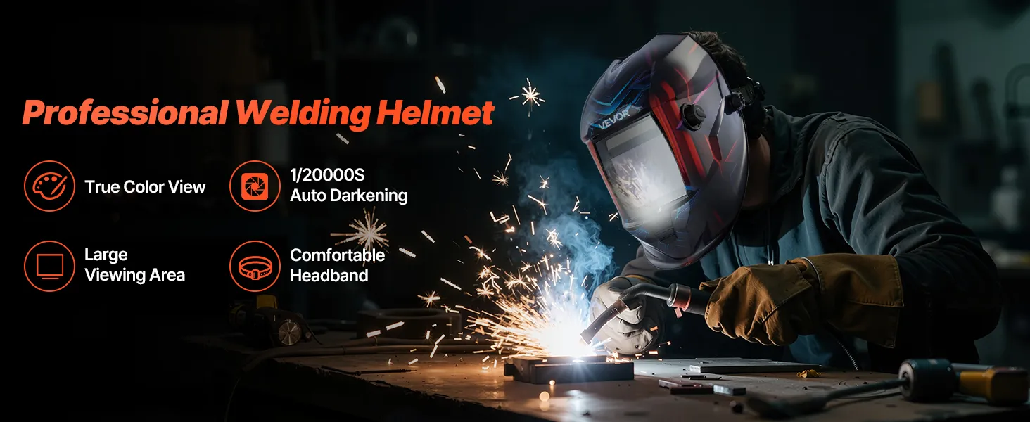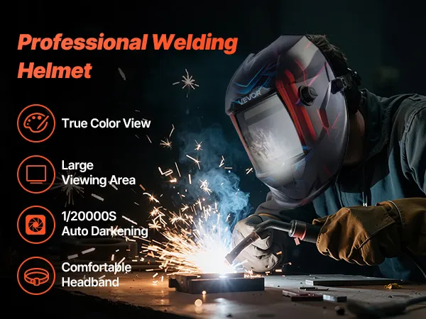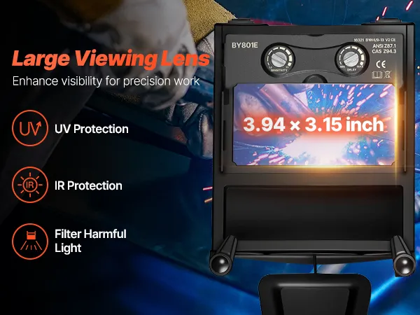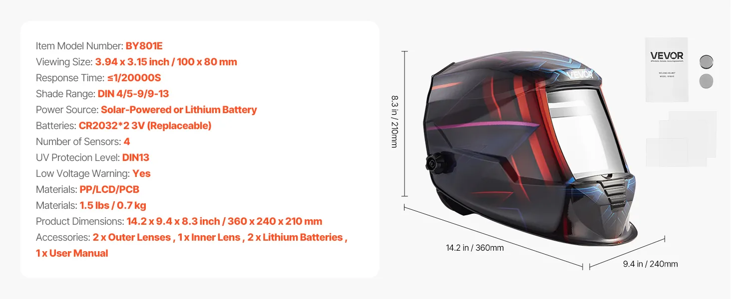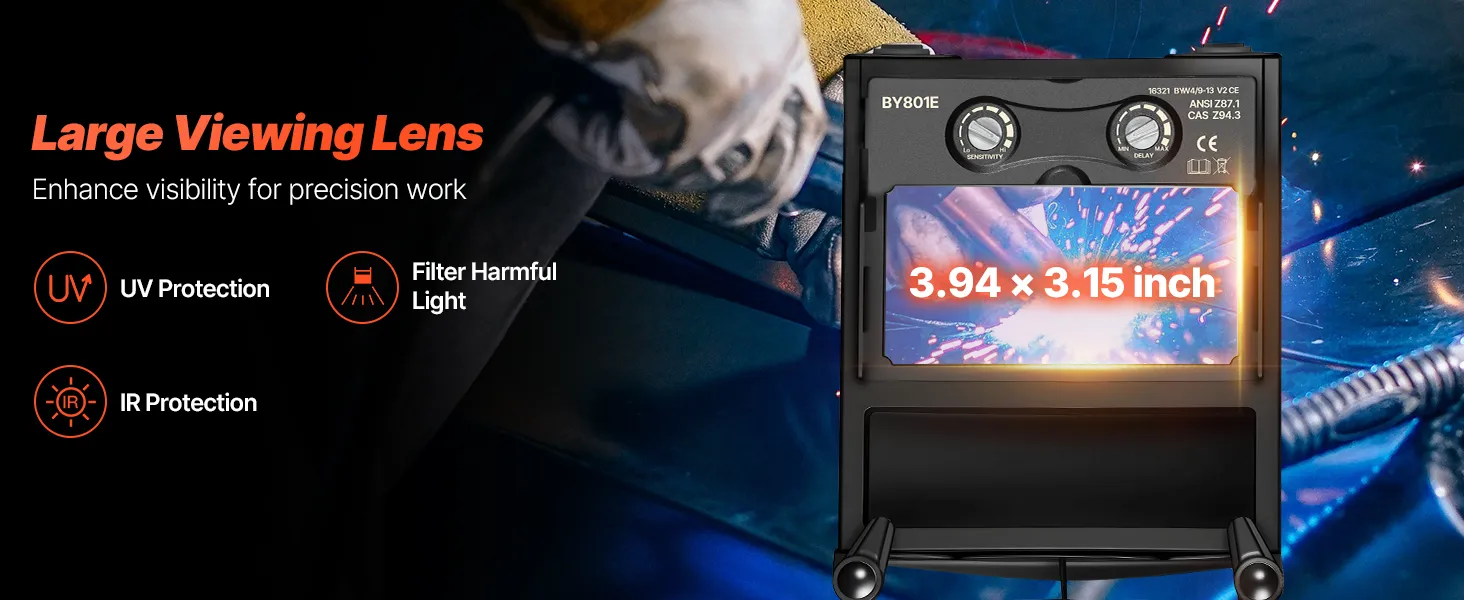 Wyświetlacz True Color: Dzięki ekranowi o wymiarach 3,94 x 3,15 cala (100 x 80 mm), ulepszonej technologii True Color i przejrzystości optycznej 1/1/1/1, hełm spawalniczy VEVOR zapewnia wyraźny, ostry i naturalny obraz, co przekłada się na bezpieczniejsze i bardziej precyzyjne spawanie.