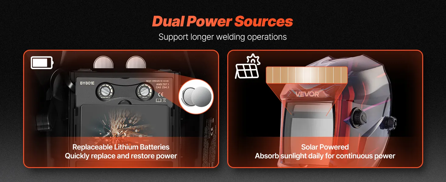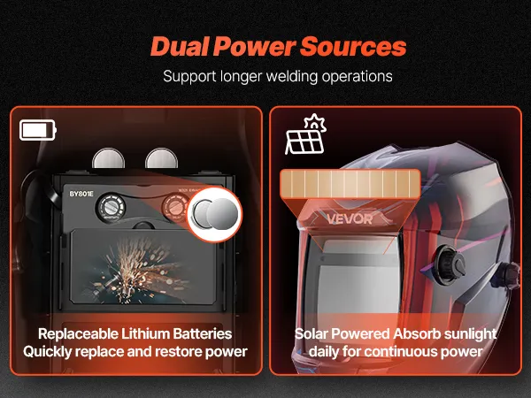 Zasilanie słoneczne: Ta samościemniająca przyłbica spawalnicza jest wyposażona w dwa akumulatory litowe i obsługuje ładowanie słoneczne, co eliminuje potrzebę częstej wymiany baterii. Stabilne zasilanie zapewnia stałą, długotrwałą wydajność.