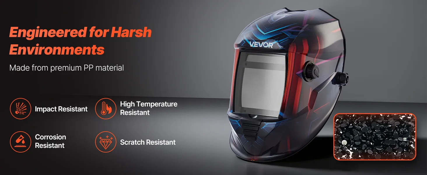 Wykonana z wysokiej jakości materiałów, ta maska spawalnicza oferuje wyjątkową trwałość, odporność na uderzenia i wysokie temperatury. Skutecznie chroni przed iskrami i oparzeniami spowodowanymi wysoką temperaturą, zapewniając niezawodną ochronę twarzy i oczu.