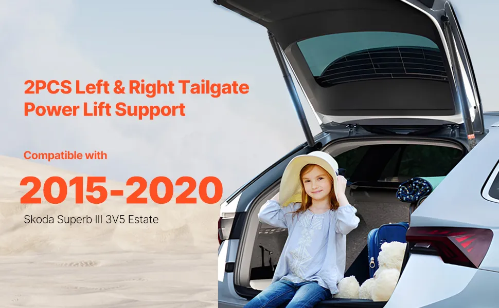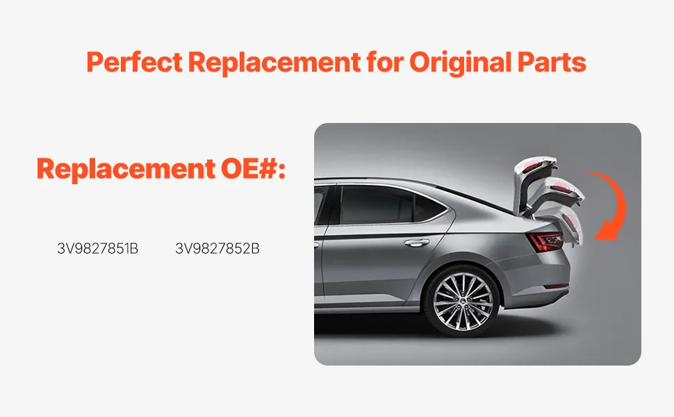 Zgodność z pojazdem: Te tylne lewe i prawe siłowniki klapy bagażnika są kompatybilne z modelem Skoda Superb III 3V5 Kombi (2015-2020). Numery części: 3V9827851B i 3V9827852B. Prosimy o potwierdzenie modelu, aby uzyskać dokładne dopasowanie.