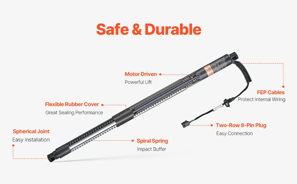 Trwałość: Nasz siłownik klapy bagażnika jest wykonany z wysokiej jakości stali i posiada elastyczną gumową osłonę oraz inne gumowe elementy, które chronią przed wyciekami i wnikaniem pyłu. Odporne na korozję i zużycie okablowanie FEP chroni elementy wewnętrzne i minimalizuje ryzyko przypadkowego uszkodzenia.