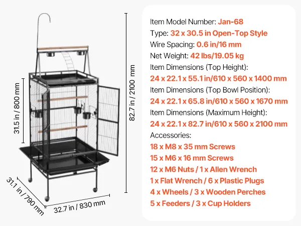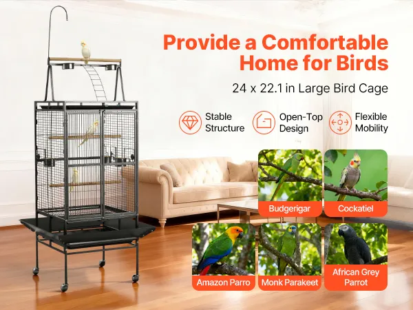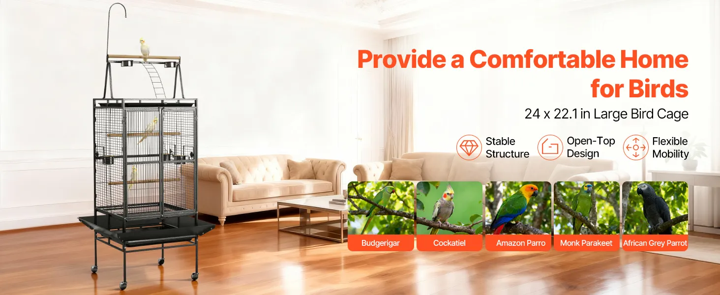 Duża przestrzeń: klatka o wymiarach 610 x 560 x 800 mm (24 x 22 x 31,5 cala) i rozstawie prętów wynoszącym 16 mm (0,6 cala) zapewnia dużo miejsca dla 2-3 średnich lub 1-2 dużych ptaków (np. nimf, mniszek, aleksandrett długoogonowych, amazonek, papug afrykańskich).