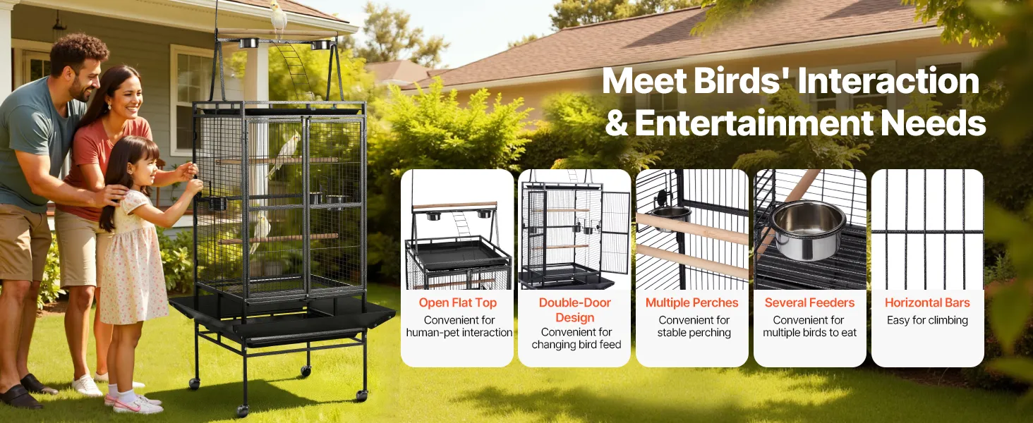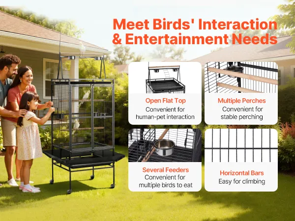 W pełni funkcjonalny: budka dla ptaków ma otwarty dach i podwójne drzwi, co zapewnia łatwy dostęp do pożywienia i interakcję. Plastikowe miski na karmę zmniejszają ryzyko urazów dziobów. Liczne grzędy i poziome panele z siatki zapewniają miejsca do stania i odpoczynku, a także wsparcie.