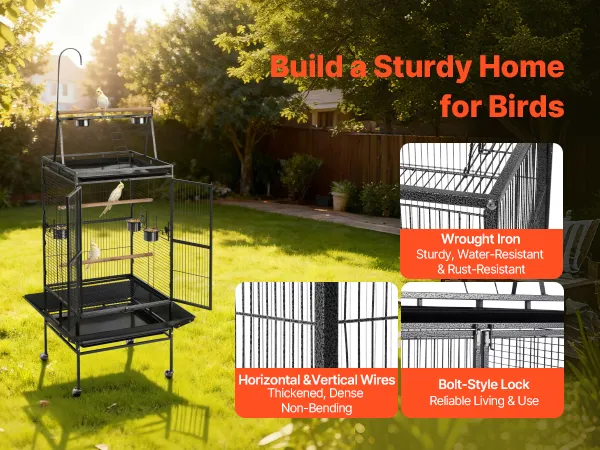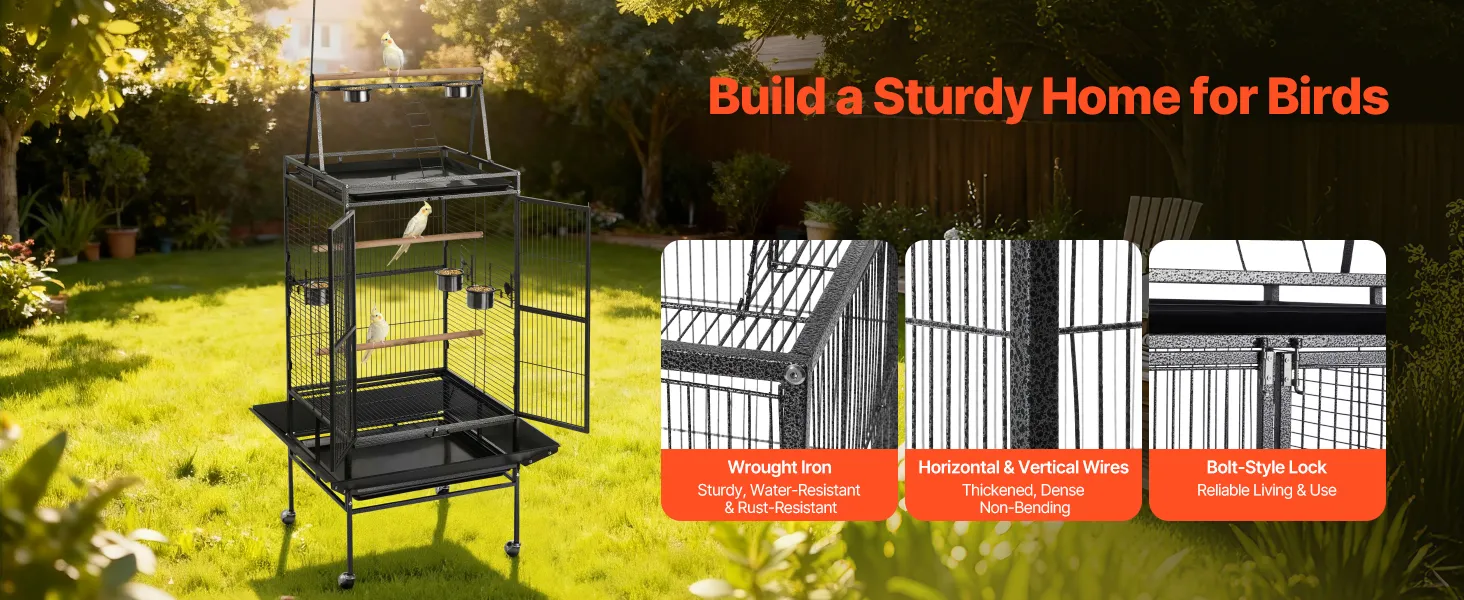 Klatka dla nimfy wykonana jest z kutego żelaza i pokryta wodoodporną i odporną na rdzę powłoką proszkową. Dzięki pogrubionym, kwadratowym rurom, wzmocnionej konstrukcji klatki i solidnie zamykanym drzwiom, zapewnia ptakom niezawodny dom.