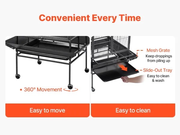 Wyposażona w cztery solidne kółka, nasza klatka dla papug jest łatwa w transporcie i można ją bez problemu ustawić w dowolnym miejscu. Wysuwana szuflada jest łatwa w czyszczeniu, a siatka oddziela ptaki od ich odchodów, zapobiegając gromadzeniu się odchodów i zapewniając czystość i świeżość przez cały czas.