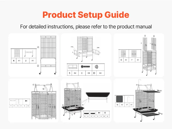 Duża klatka dla ptaków jest dostarczana ze wszystkimi niezbędnymi akcesoriami i szczegółową instrukcją montażu. Nie wymaga dodatkowych narzędzi; można ją szybko zmontować i zapewnić zwierzętom stabilne siedlisko.