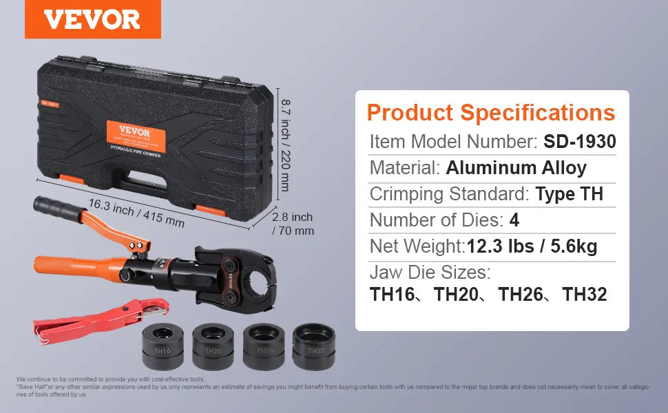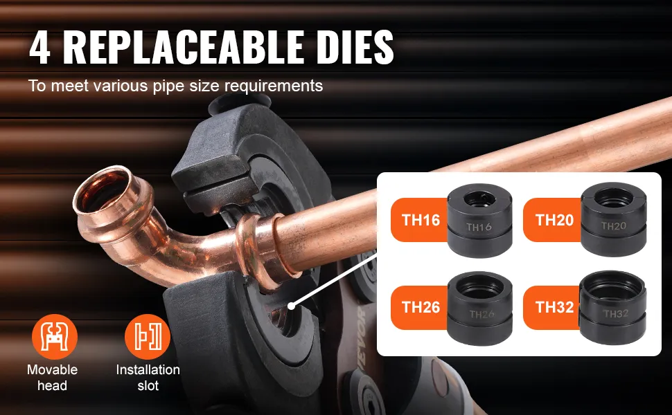 Uniwersalna kompatybilność z matrycami: To profesjonalne narzędzie do zaciskania rur miedzianych jest wyposażone w 4 matryce do rur TH16, TH20, TH26 i TH32, dzięki czemu spełnia wymagania zaciskania rur o różnych rozmiarach i jest odpowiednie dla różnych standardów przemysłowych.