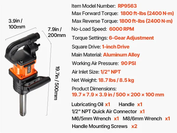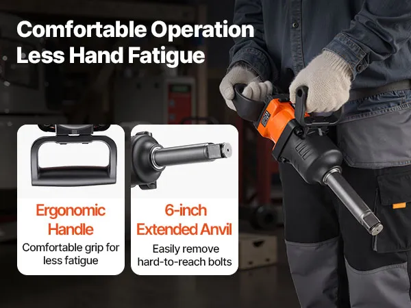Klucz udarowy pneumatyczny VEVOR, moment obrotowy do odkręcania nakrętek do 2400 Nm, 6000 obr./min, 6-biegowy pistolet pneumatyczny z przedłużonym kowadłem 152,4 mm do ciężkich samochodów ciężarowych, autobusów i maszyn rolniczych