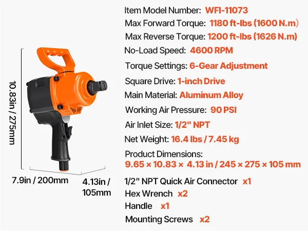 Ten 1-calowy (2,54 cm) pneumatyczny klucz udarowy zapewnia wysoki moment obrotowy do 1626 Nm i prędkość obrotową bez obciążenia 4600 obr./min. Bez wysiłku odkręca śruby i nakrętki, dzięki czemu idealnie nadaje się do napraw i konserwacji ciężkich pojazdów, takich jak ciężarówki, przyczepy, autobusy, maszyny i urządzenia przemysłowe.