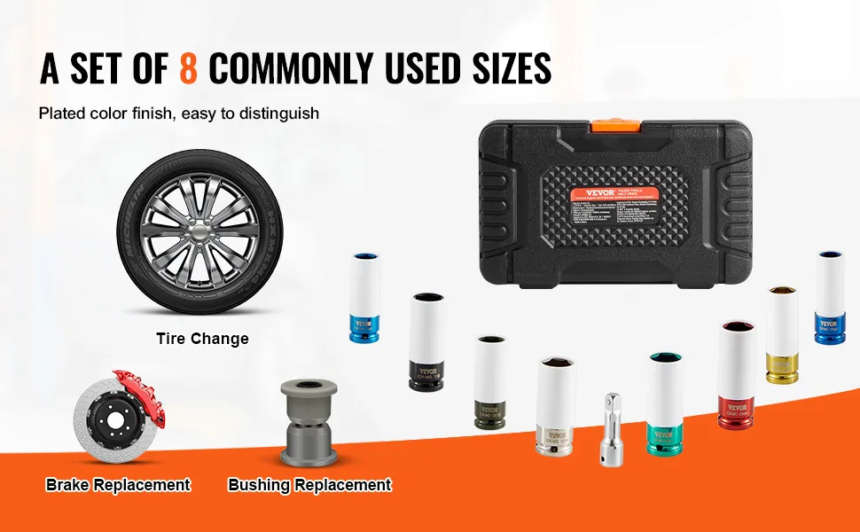 Zestaw nasadek udarowych do nakrętek kół VEVOR do napędu 12,7 mm, metrycznych i SAE, zestaw nasadek głębokich 6-kątnych, łącznie 8 rozmiarów nakrętek kół, zestaw nasadek do nakrętek kół wykonany ze stali CR-MO