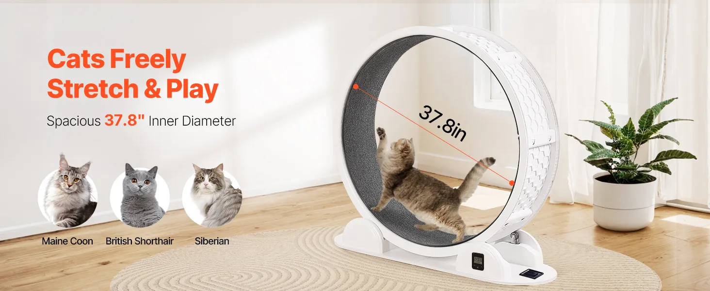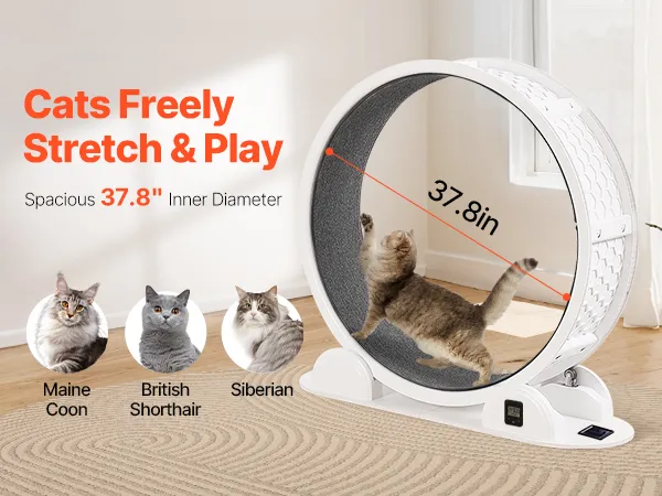 Idealny dla większości ras: Dzięki przestronnemu wnętrzu o długości 960 mm i szerokości 260 mm, ten kołowrotek jest idealny dla kotów o wadze do 13,6 kg, w tym popularnych ras, takich jak maine coon, brytyjski krótkowłosy i syberyjski. Pozwól swojemu kotu rozciągać się i wyładować energię w wielkim stylu!