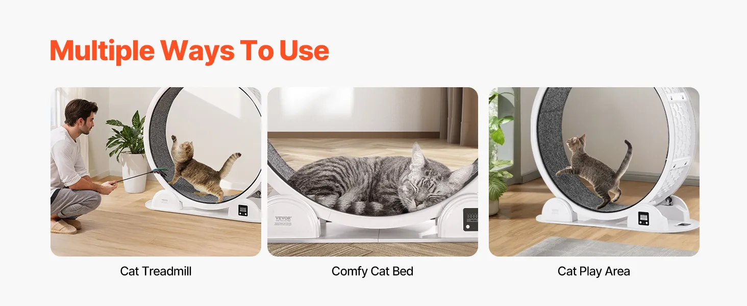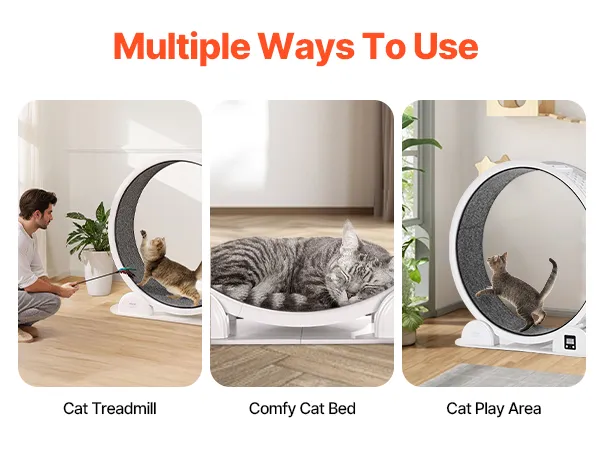 Wielofunkcyjna zabawa: Ta wszechstronna bieżnia dla kota to coś więcej niż tylko bieżnia. Można ją przekształcić w interaktywną zabawkę, przytulne legowisko dla kota lub stylowy mebel. Dzięki funkcji blokady, która umożliwia zabawę w pozycji stacjonarnej, bieżnia umożliwia bieganie, kręcenie się, wspinanie i drzemki – zapewniając Twojemu ukochanemu pupilowi niekończącą się radość i rozrywkę!