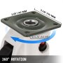Kółka poziomujące VEVOR, obrót 360°, wymiary podane na płycie montażowej.