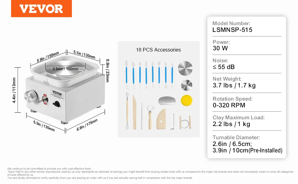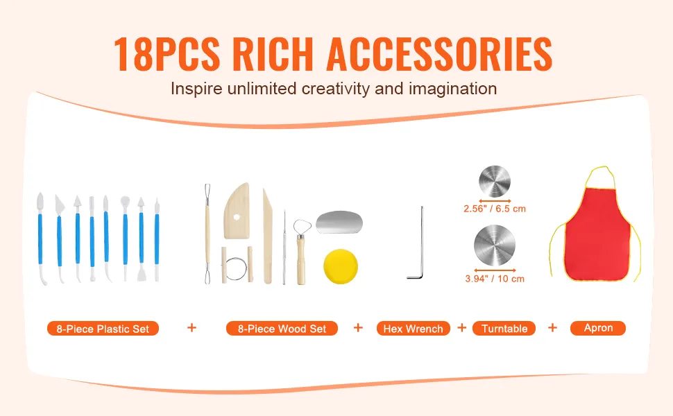 Kompletny zestaw narzędzi: Koło garncarskie zawiera kompletny zestaw narzędzi, w tym 8-częściowy zestaw do rzeźbienia, 8-częściowy plastikowy zestaw narzędzi oraz wodoodporny fartuch. Spełnia wszystkie Twoje potrzeby związane z ceramiką i jest szczególnie odpowiednie dla początkujących.