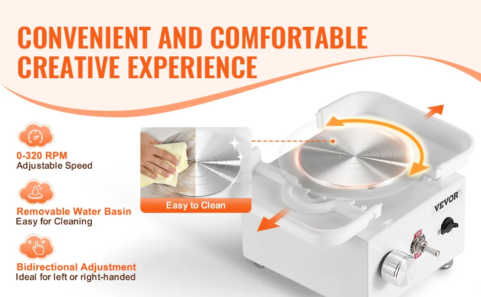 Komfortowa obsługa: Koło garncarskie posiada dwukierunkową regulację i regulację prędkości od 0 do 320 obr./min, co ułatwia obsługę nawet początkującym. Poziom hałasu ≤ 55 dB zapewnia ciche i komfortowe środowisko pracy, w którym można uwolnić swoją kreatywność.