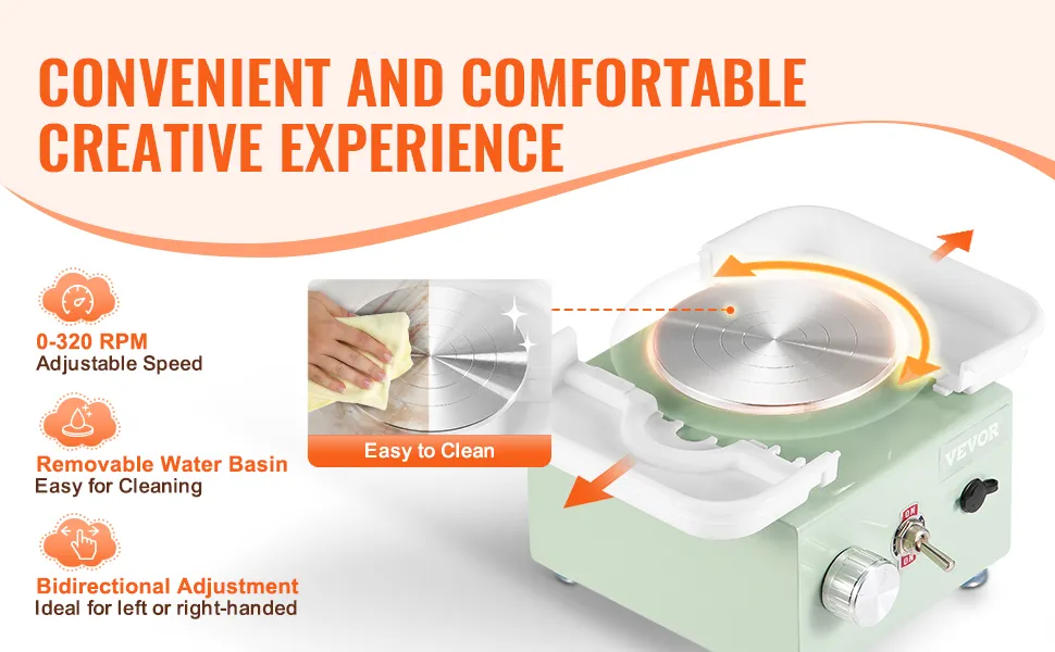 Komfortowa obsługa: Koło garncarskie posiada dwukierunkową regulację i regulację prędkości od 0 do 320 obr./min, co ułatwia obsługę nawet początkującym. Poziom hałasu ≤ 55 dB zapewnia ciche i komfortowe środowisko pracy, w którym można uwolnić swoją kreatywność.
