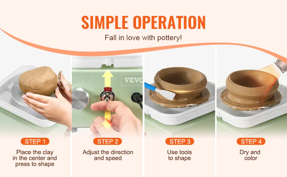 To elektryczne koło garncarskie zostało zaprojektowane z myślą o prostej i przyjaznej obsłudze, odpowiedniej dla użytkowników w każdym wieku. Niezależnie od tego, czy jesteś początkującym, czy doświadczonym garncarzem, koło garncarskie jest łatwe w obsłudze i odpowiednie dla każdego.