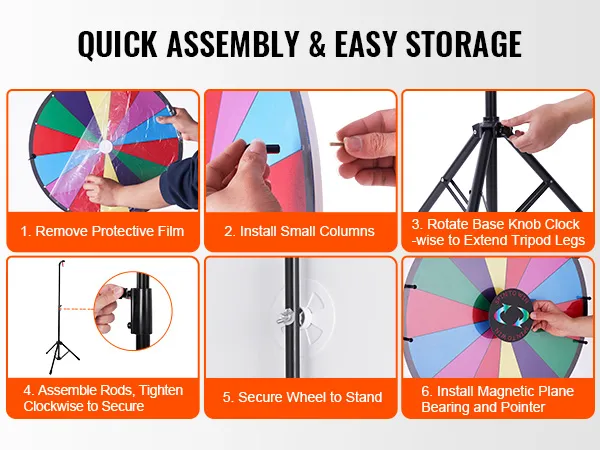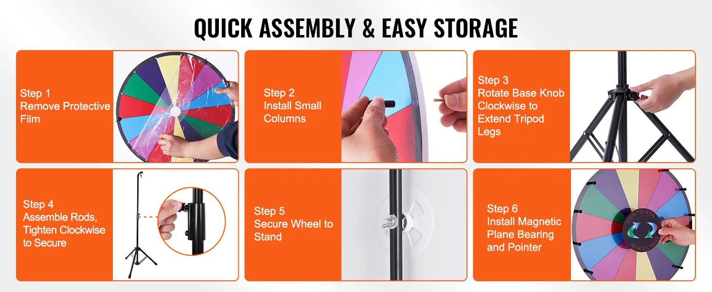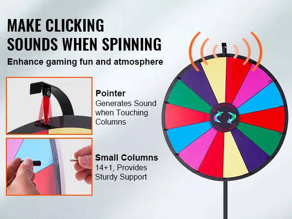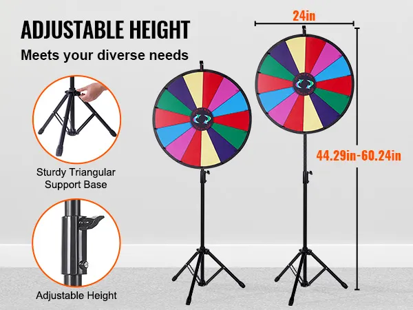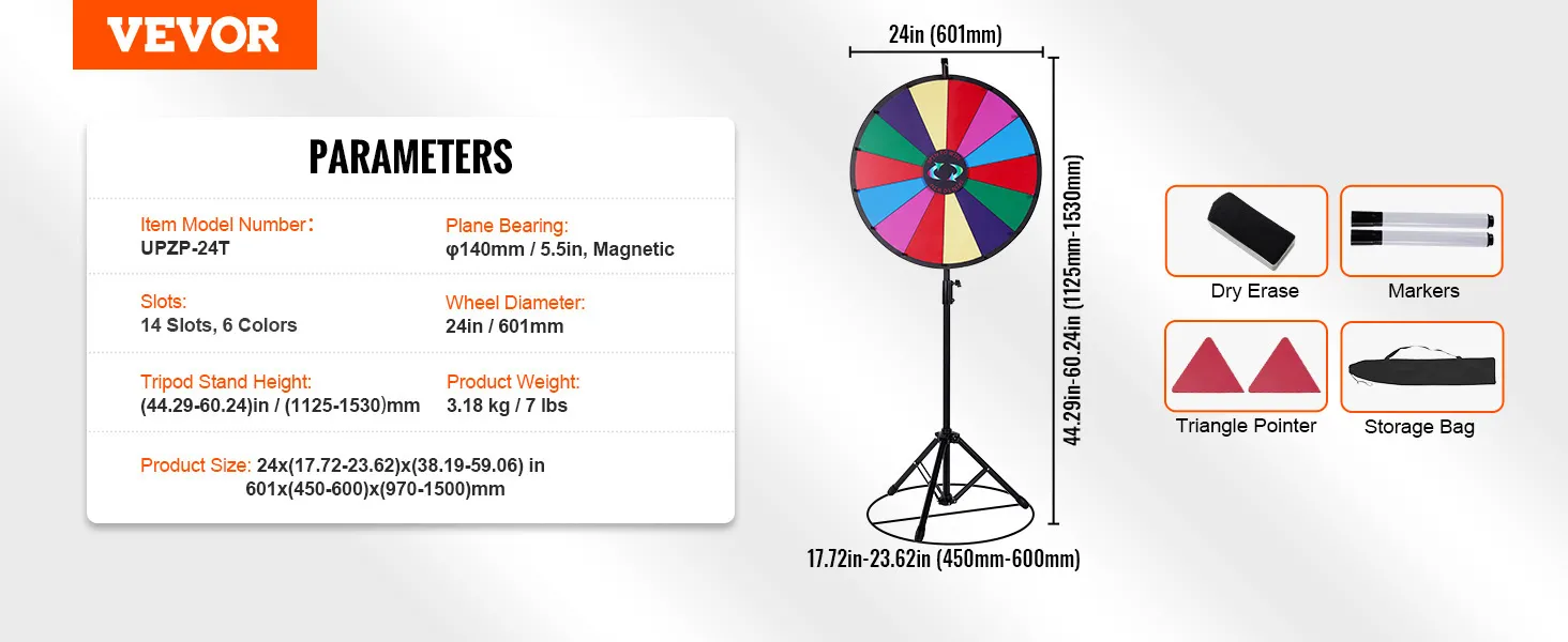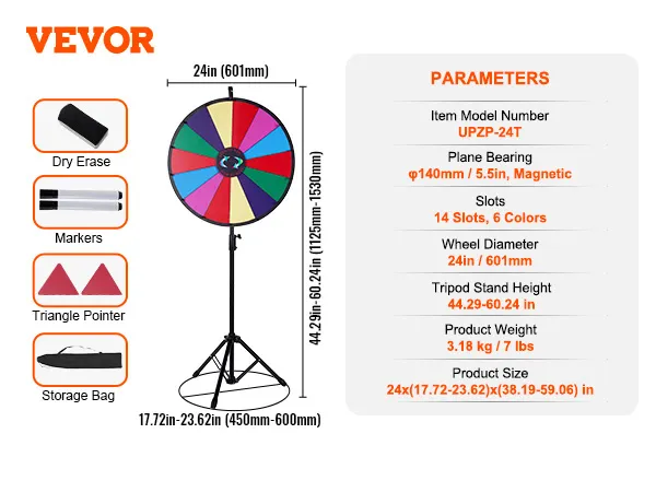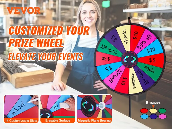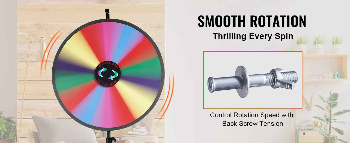 Whether you're a company, event organizer, or venue – the VEVOR Wheel of Fortune is the perfect solution. With customizable slots, smooth spinning, convenient portability, exciting click sounds, and extensive accessories, our product guarantees a unique gaming experience and a lasting impression at your event.