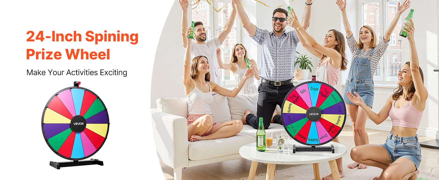 Możliwość personalizacji i edycji: 14 pól, które pozwolą Ci spersonalizować swoje gry. Gładka, powtarzalna plansza w jaskrawych kolorach sprawi, że Twoje koło nagród wyróżni się na każdym wydarzeniu.