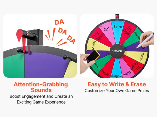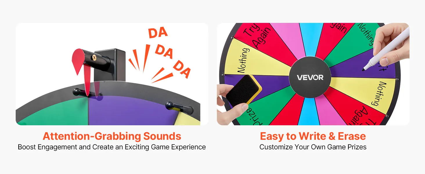 Ekscytująca atmosfera: Chcesz ożywić swoje wydarzenie? Nasze Koło Fortuny wydaje czysty dźwięk klikania podczas kręcenia się, zwiększając napięcie i emocje, przyciągając tłumy i angażując graczy.