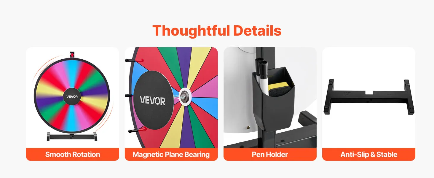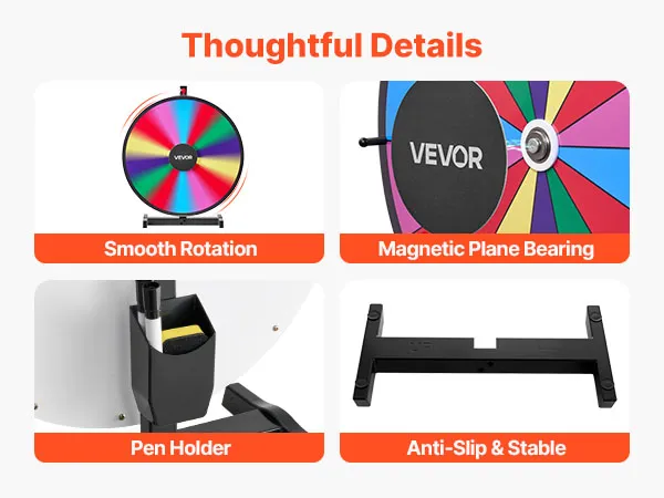 Płynny obrót dzięki precyzyjnym łożyskom i antypoślizgowej podstawie zapewnia stabilność i bezpieczeństwo użytkowania. Koło fortuny jest wyposażone w uchwyt na długopis, ułatwiający przechowywanie.