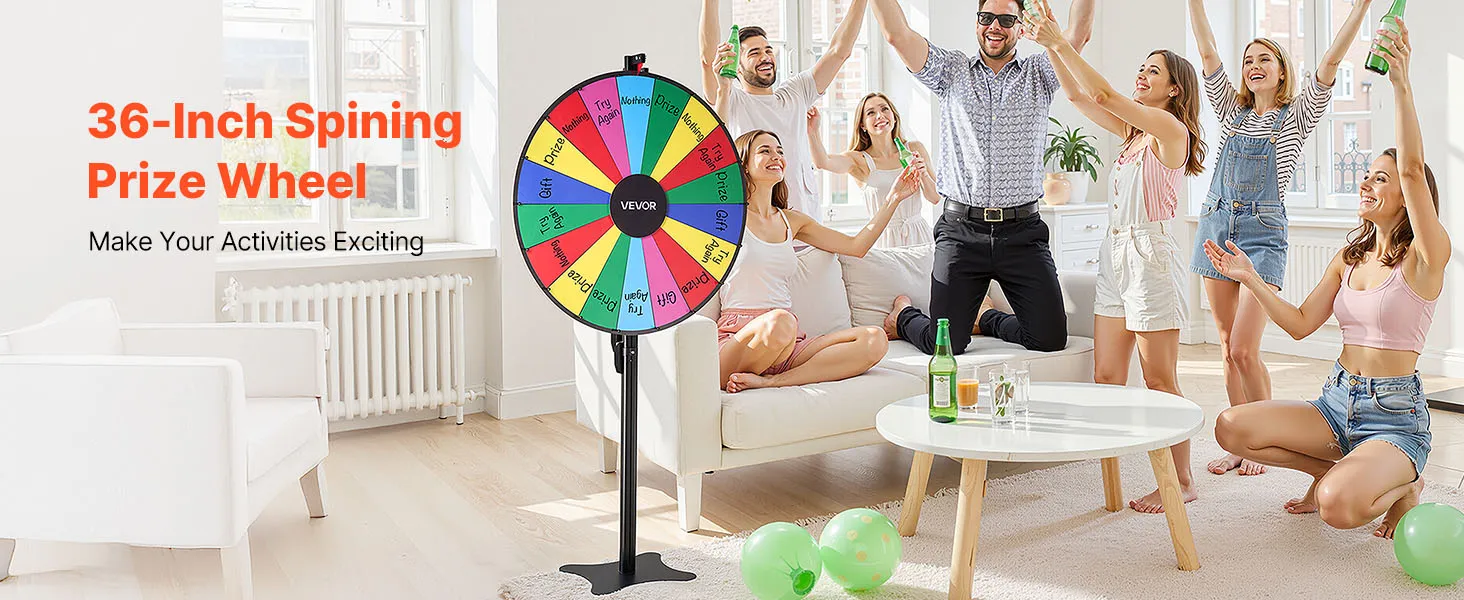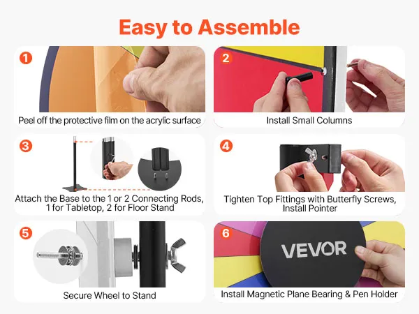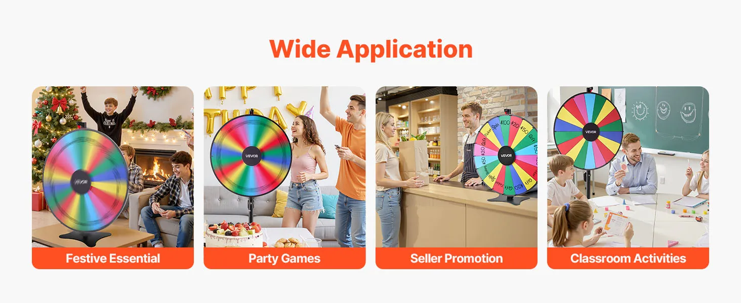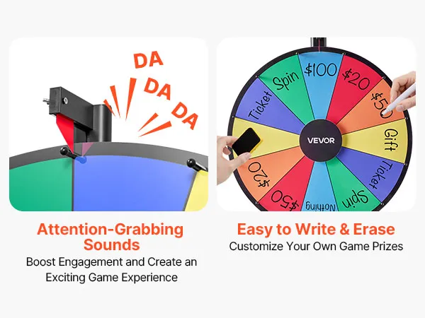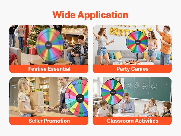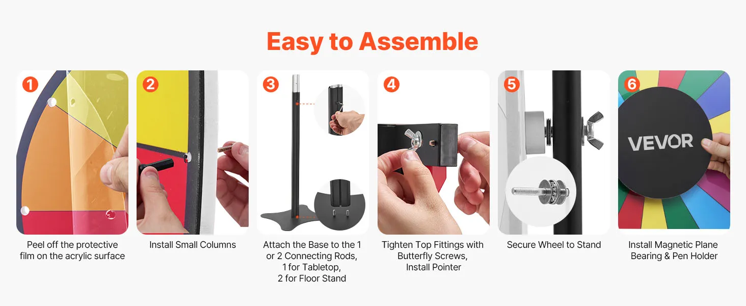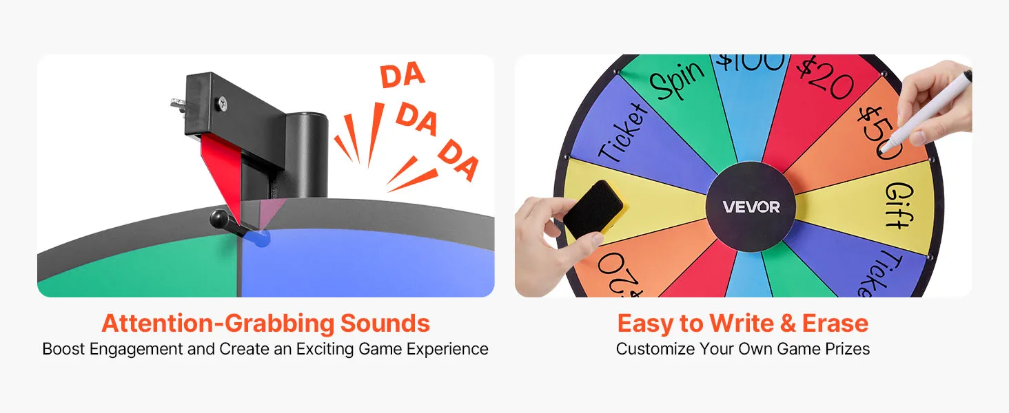Stojak stołowy i podłogowy: To koło fortuny oferuje dwie opcje montażu. Użyj drążka i podstawy do montażu stołowego (40 cali/1005 mm); dodaj drugi drążek do montażu podłogowego (71 cali/1805 mm). Idealny na imprezy, targi, sale lekcyjne i wiele innych.