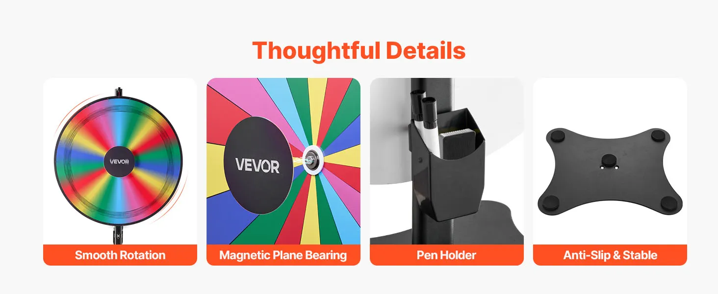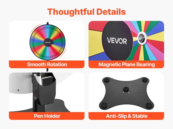 Płynny obrót dzięki precyzyjnym łożyskom i antypoślizgowej podstawie zapewnia stabilność i bezpieczeństwo użytkowania. Koło fortuny jest wyposażone w uchwyt na długopis, ułatwiający przechowywanie.