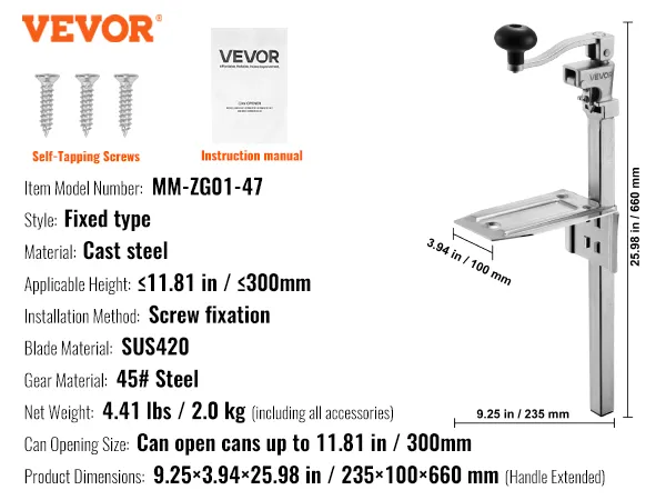 Otwieracz do puszek VEVOR, komercyjny, ręczny otwieracz stołowy do puszek o wysokości do 30 cm, otwieracz do puszek z regulacją wysokości za pomocą śrub, otwieracz do puszek ze stali odlewanej do restauracji i hoteli