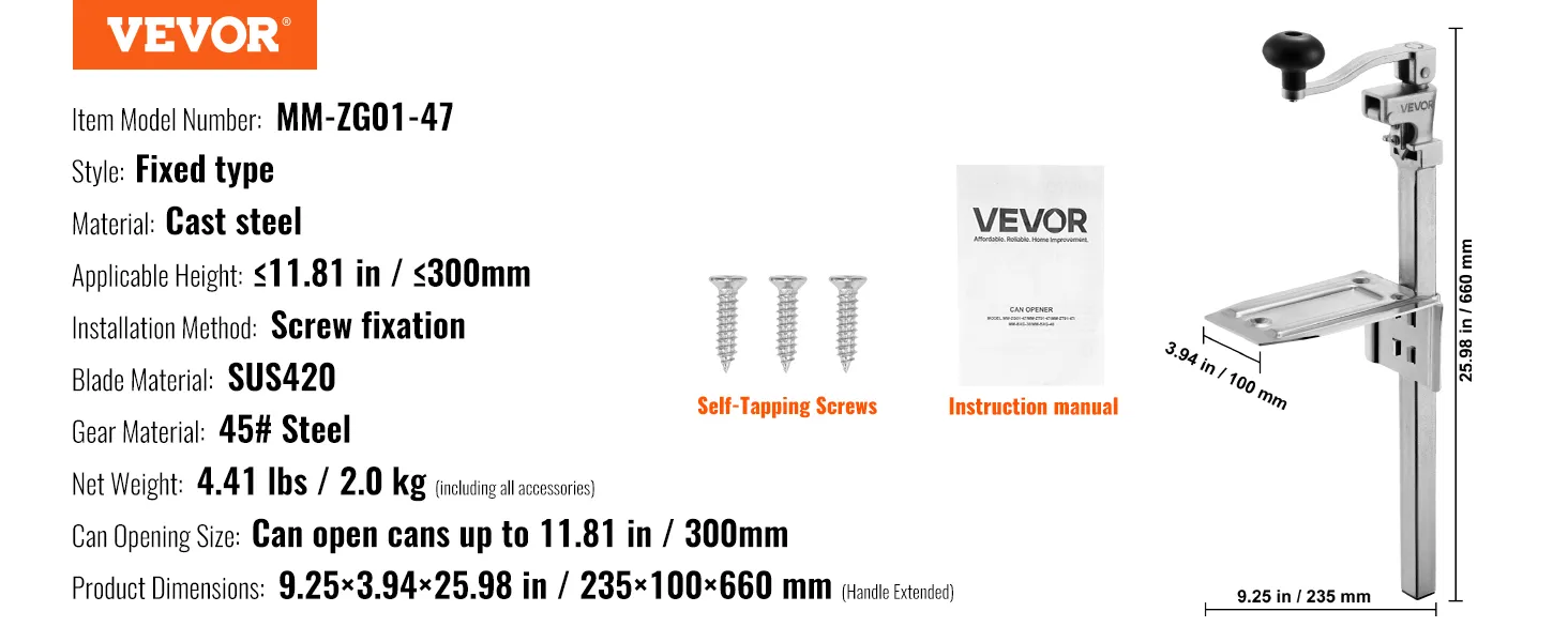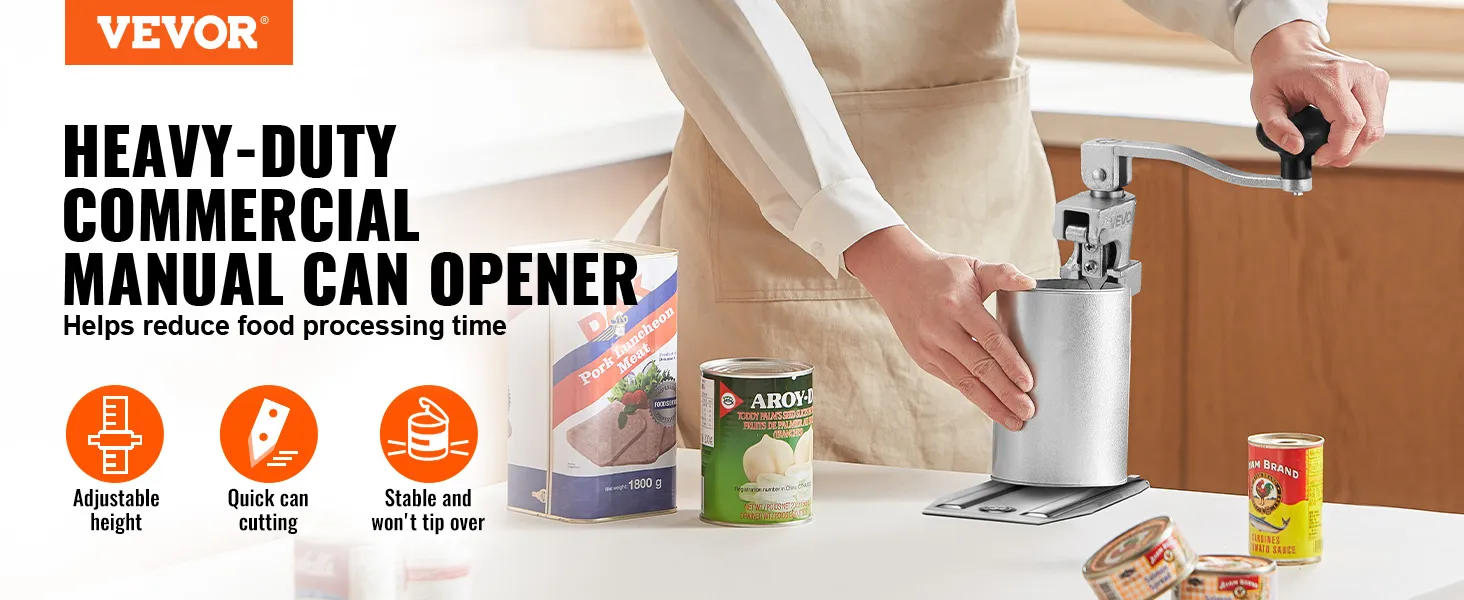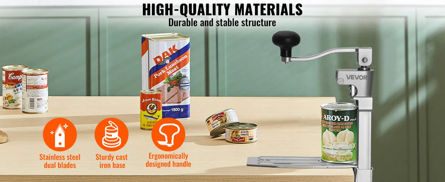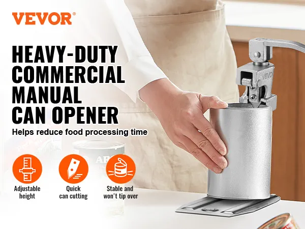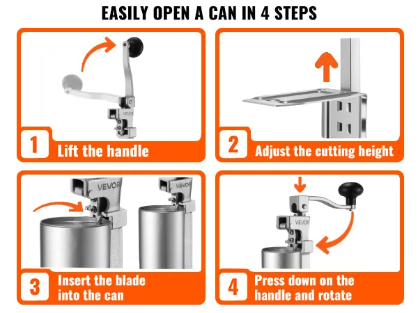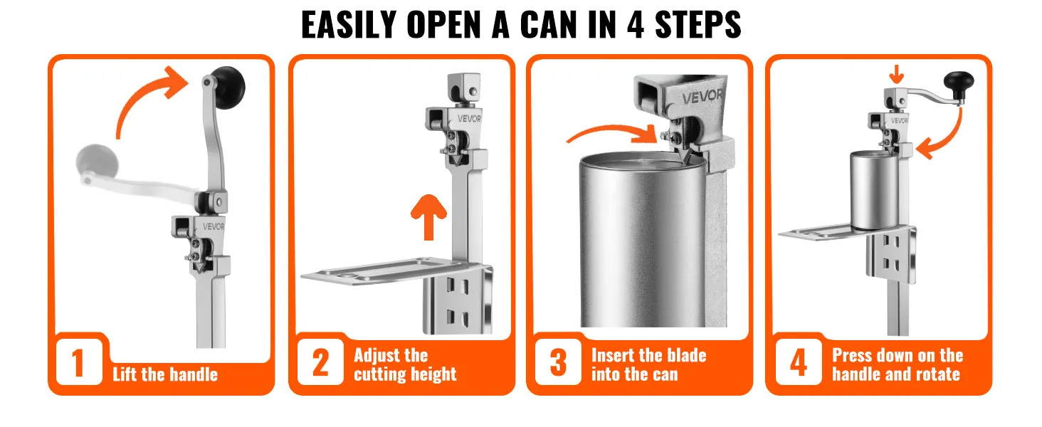 Łatwy w użyciu: Wystarczy umieścić puszkę, wyregulować wysokość, opuścić ostrze i uchwyt, a następnie obrócić, aby otworzyć ją w 4 prostych krokach. Nawet początkujący z łatwością poradzą sobie z obsługą tego wytrzymałego otwieracza do puszek.
