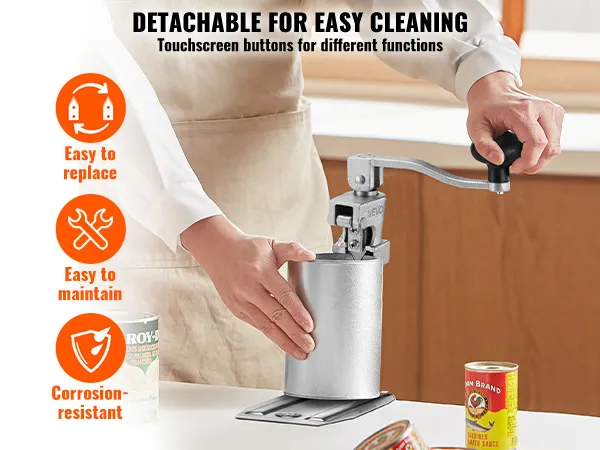 Zdejmowana i rozdzielna konstrukcja ostrza i przekładni tego ręcznego otwieracza do puszek nie tylko ułatwia wymianę i montaż, ale także upraszcza codzienne czyszczenie i konserwację.