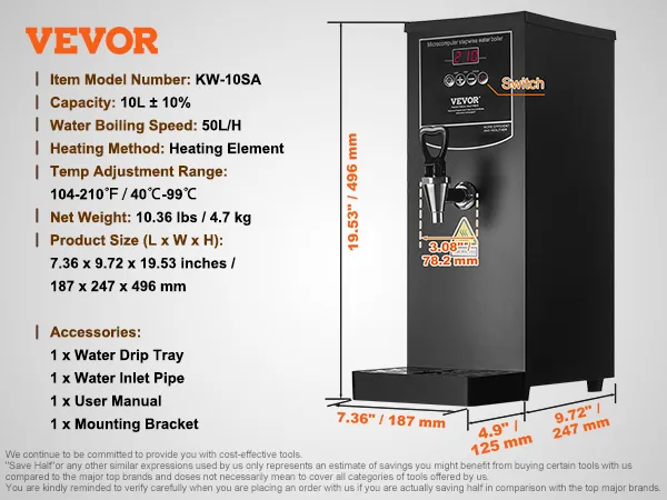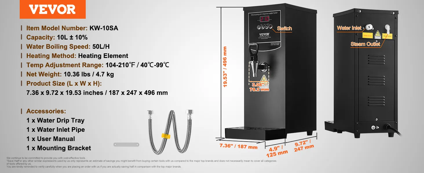 VEVOR Komercyjny podgrzewacz wody 10 l, czajnik elektryczny o mocy 1,5 kW z rurą grzewczą ze stali nierdzewnej 316, płynne i szybkie podgrzewanie. Podgrzewacz wody 50 l/h do kawiarni, herbaciarni, restauracji i biur. VEVOR Komercyjny podgrzewacz wody 10 l, czajnik elektryczny o mocy 1,5 kW z rurą grzewczą ze stali nierdzewnej 316, płynne i szybkie podgrzewanie. Podgrzewacz wody 50 l/h do kawiarni, herbaciarni, restauracji i biur.