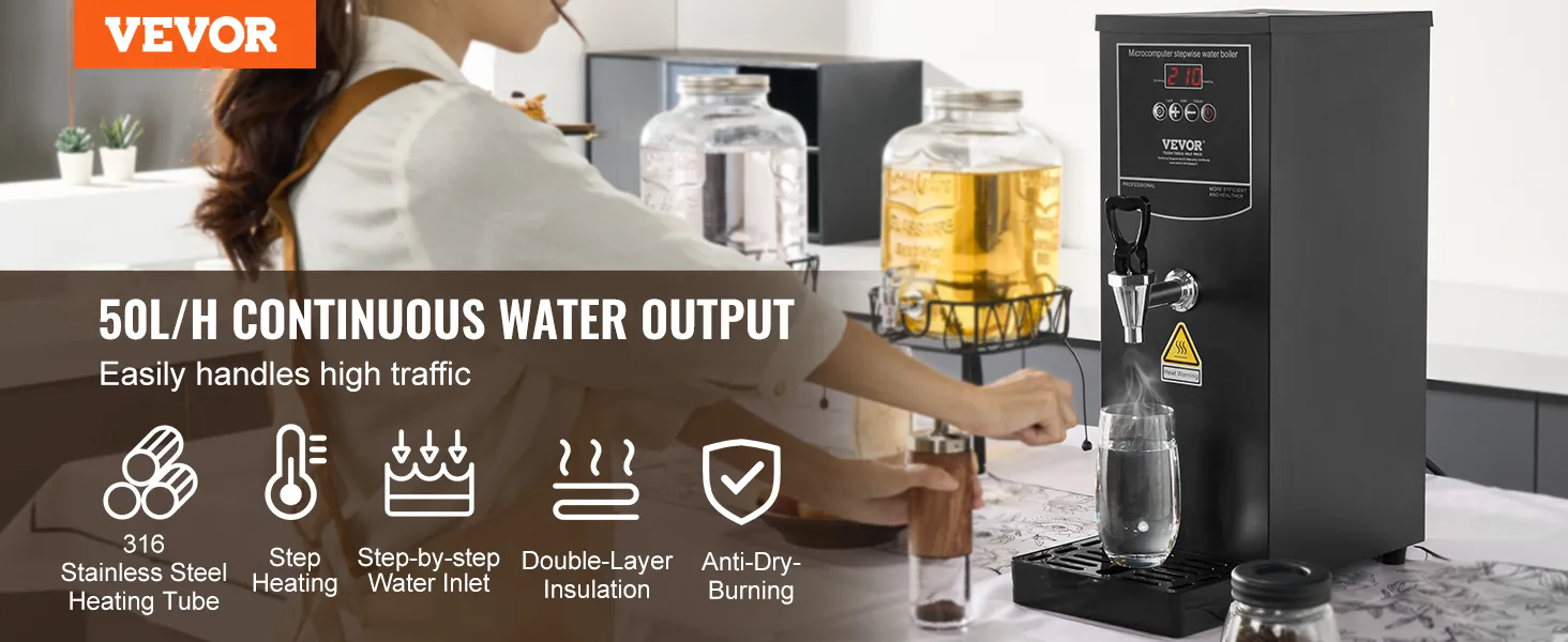 • Wszechstronne zastosowanie: Ten podgrzewacz wody oferuje maksymalną niezawodność. Wyposażony jest w kompleksowe funkcje, takie jak zabezpieczenie przed pracą na sucho i automatyczne wyłączanie przy niskim poziomie wody. Solidny, niekapiący kran zapewnia stały, bezrozpryskowy przepływ wody – dla bezpiecznego i łatwego dozowania. Idealny do biur, herbaciarni, kawiarni, restauracji i hoteli.