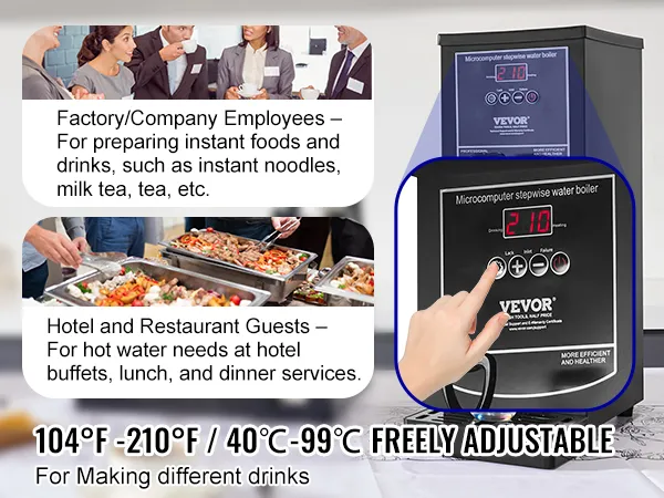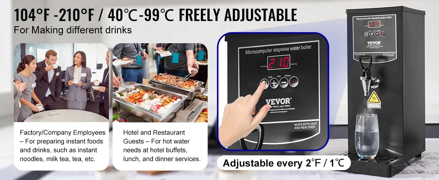 • Precyzyjna kontrola temperatury: Dzięki regulowanemu zakresowi temperatury od 40°C do 99°C (od 104°F do 210°F) masz pełną kontrolę nad temperaturą wody dla różnych napojów. Cyfrowy wyświetlacz LED wyraźnie pokazuje aktualną temperaturę wody, umożliwiając łatwe monitorowanie procesu podgrzewania. Bojler automatycznie uzupełnia i podgrzewa wodę, aby utrzymać zadaną temperaturę. Inteligentny system zapisuje ustawienia również po zaniku zasilania.