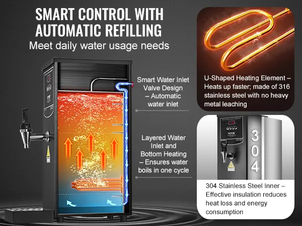 Element grzejny ze stali nierdzewnej 316 zapewnia bezpieczną wodę pitną, wolną od metali ciężkich. Dzięki w pełni automatycznemu systemowi zaopatrzenia w wodę, ręczne uzupełnianie jest zbędne. System stopniowego podgrzewania podgrzewa tylko wymaganą ilość wody, minimalizując straty wody i zużycie energii.