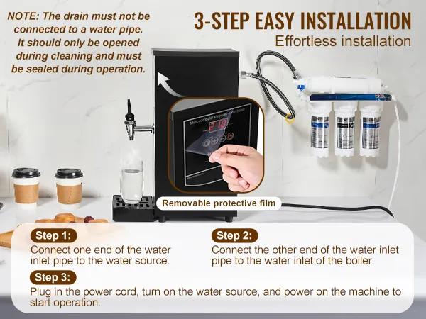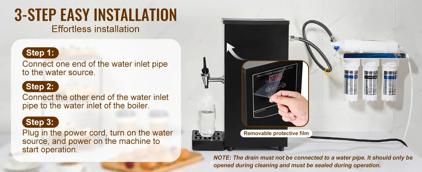 Podłącz wąż doprowadzający wodę bezpośrednio do źródła wody i wlotu kotła – dla szybkiej i łatwej instalacji. Ze względu na regionalne różnice w jakości wody, zaleca się czyszczenie podgrzewacza wody co 1–2 miesiące, aby zapewnić optymalną wydajność.