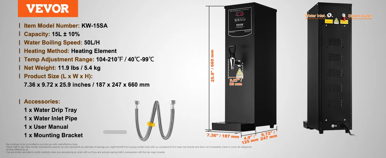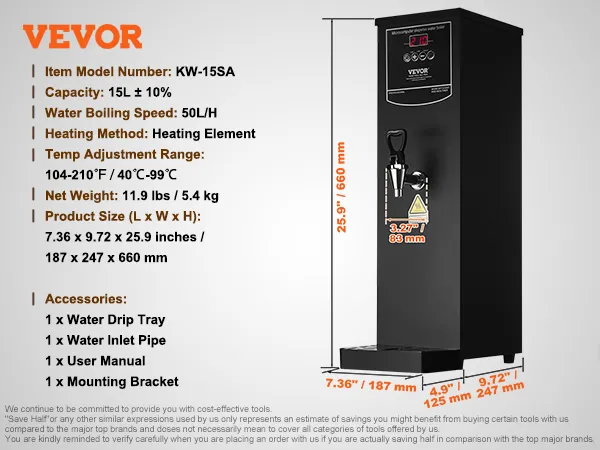 VEVOR Komercyjny podgrzewacz wody 15 l, czajnik elektryczny o mocy 1,5 kW z elementem grzejnym ze stali nierdzewnej 316, płynne, szybkie nagrzewanie, podgrzewacz wody 50 l/h do kawiarni, herbaciarni, restauracji i biur