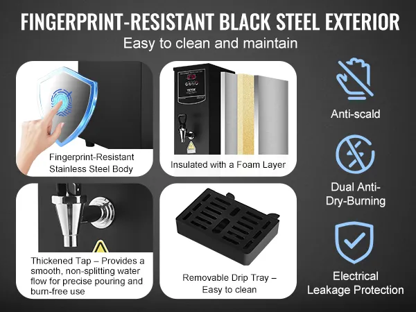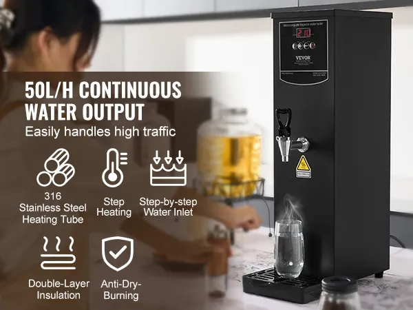 Wszechstronne zastosowanie: Ten podgrzewacz wody oferuje maksymalną niezawodność. Wyposażony jest w kompleksowe funkcje, takie jak zabezpieczenie przed pracą na sucho i automatyczne wyłączanie przy niskim poziomie wody. Solidny, niekapiący kran zapewnia stały, bezrozpryskowy przepływ wody – dla bezpiecznego i łatwego dozowania. Idealny do biur, herbaciarni, kawiarni, restauracji i hoteli.