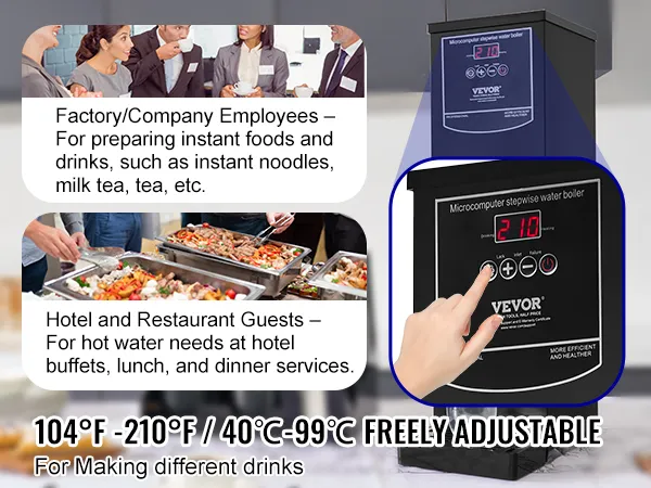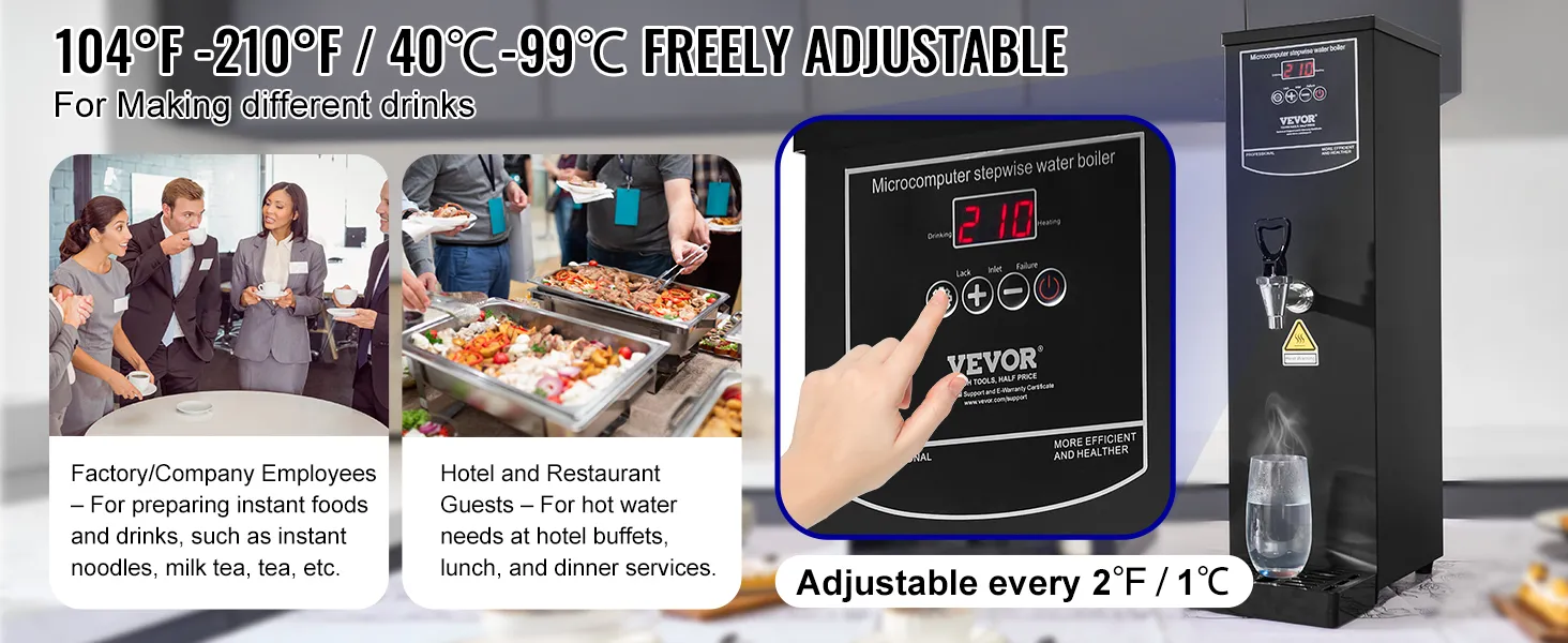 Precyzyjna kontrola temperatury: Dzięki regulowanemu zakresowi od 40°C do 99°C (104°F–210°F) masz pełną kontrolę nad temperaturą wody dla różnych napojów. Cyfrowy wyświetlacz LED wyraźnie pokazuje aktualną temperaturę i umożliwia łatwe monitorowanie procesu podgrzewania. Podgrzewacz napełnia się automatycznie i utrzymuje wybraną temperaturę. Dzięki funkcji pamięci ustawienia są zapisywane nawet po zaniku zasilania.