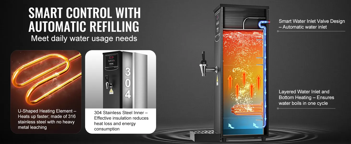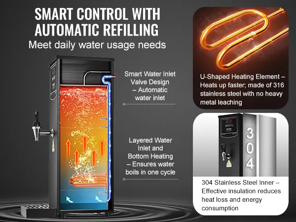 Element grzejny ze stali nierdzewnej 316 zapewnia bezpieczną wodę pitną, wolną od metali ciężkich. Dzięki w pełni automatycznemu systemowi zaopatrzenia w wodę, ręczne uzupełnianie jest zbędne. System stopniowego podgrzewania podgrzewa tylko wymaganą ilość wody, minimalizując straty wody i zużycie energii.