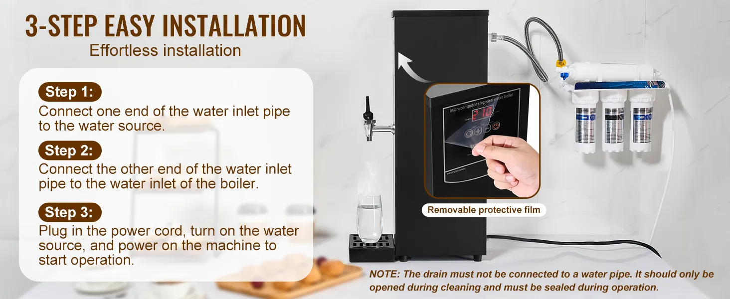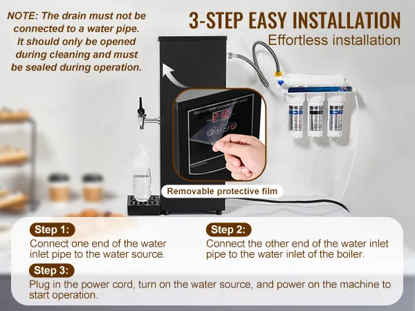Podłącz wąż doprowadzający wodę bezpośrednio do źródła wody i wlotu kotła – dla szybkiej i łatwej instalacji. Ze względu na regionalne różnice w jakości wody, zaleca się czyszczenie podgrzewacza wody co 1–2 miesiące, aby zapewnić optymalną wydajność.