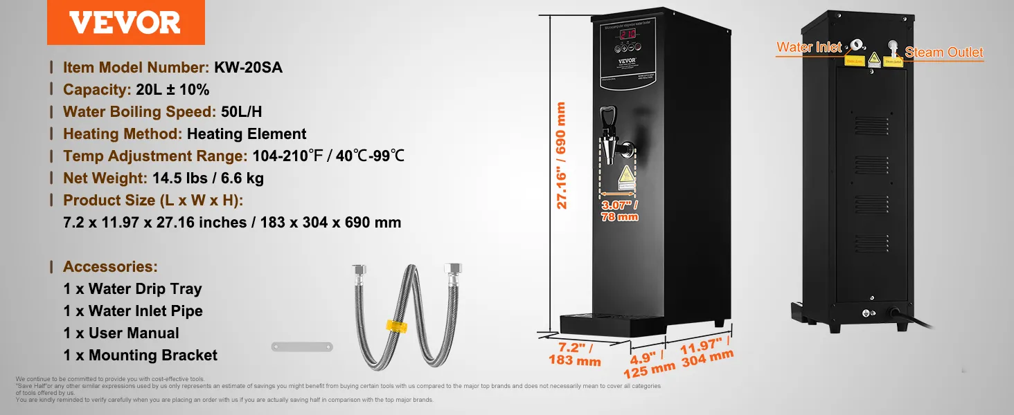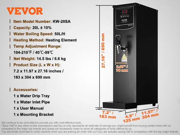 VEVOR Komercyjny podgrzewacz wody 20 l, czajnik elektryczny o mocy 1,5 kW z rurą grzewczą ze stali nierdzewnej 316, płynne i szybkie podgrzewanie. Podgrzewacz wody 50 l/h do kawiarni, herbaciarni, restauracji i biur.