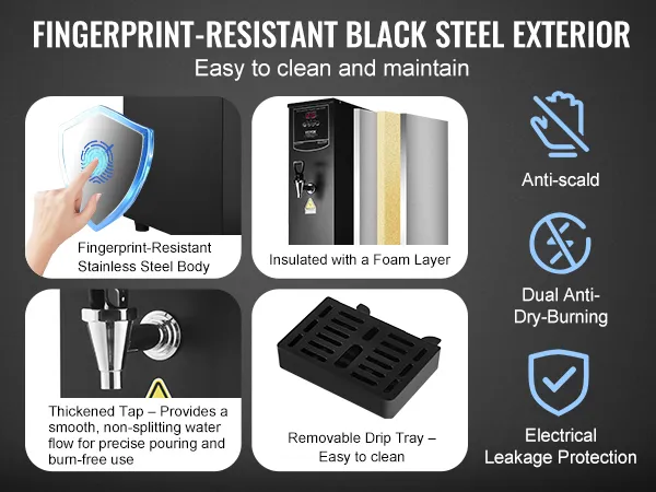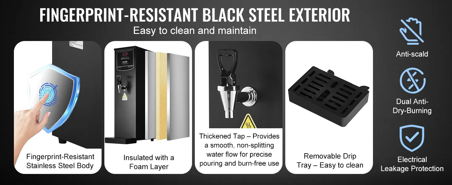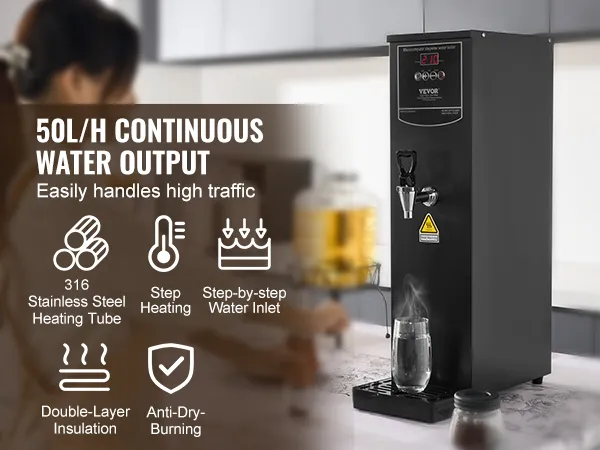 Wszechstronne zastosowanie: Ten podgrzewacz wody oferuje maksymalną niezawodność. Wyposażony jest w kompleksowe funkcje, takie jak zabezpieczenie przed pracą na sucho i automatyczne wyłączanie przy niskim poziomie wody. Solidny, niekapiący kran zapewnia stały, bezrozpryskowy przepływ wody – dla bezpiecznego i łatwego dozowania. Idealny do biur, herbaciarni, kawiarni, restauracji i hoteli.