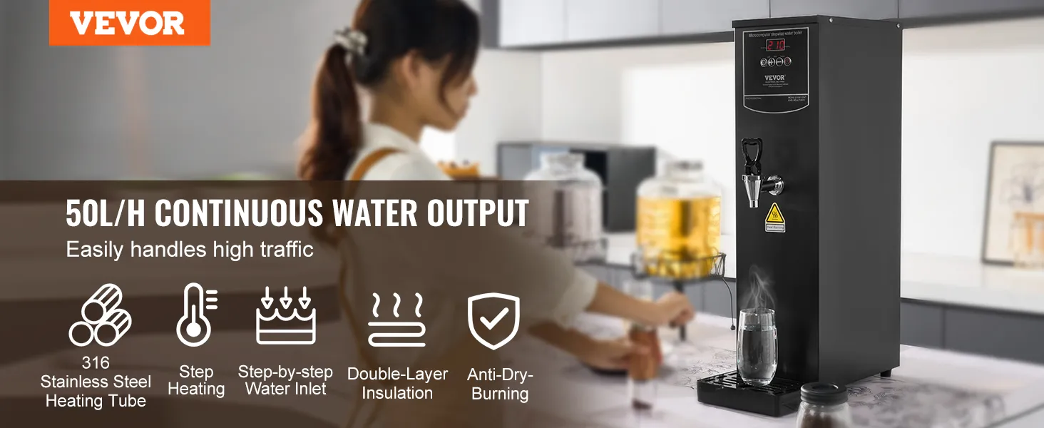 Dzięki wydajności do 50 litrów na godzinę, ten komercyjny podgrzewacz wody stale przygotowuje do 200 filiżanek (po 250 ml każda). Dzięki temu Twoi goście nie będą musieli czekać w kolejce, nawet w godzinach szczytu.